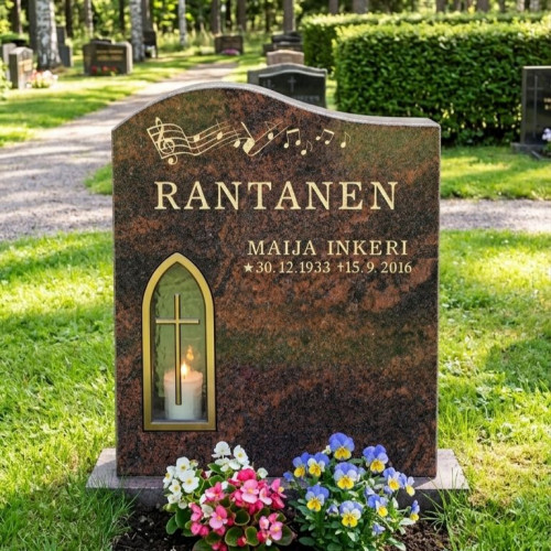 Muistomerkin yläosaa koristavat kaiverretut nuotit, jotka muistuttavat yhteisistä hetkistä ja musiikin merkityksestä läheiselle. Kultaiset kaiverrukset ja kaunis lyhtyrakenne sopivat hyvin yhteen malliin valittujen kivilajien kanssa. Lisäominaisuutena saatavilla kiillotetut sivut, jotka pitävät muistomerkin helppohoitoisena. Tähän malliin on saatavilla myös kauniit pronssivarpuset kiven yläosaan sekä kukka-aukollinen pohjakivi seurakunnan sääntöjen sen salliessa rajaamaan hauta-alueen istutukset.