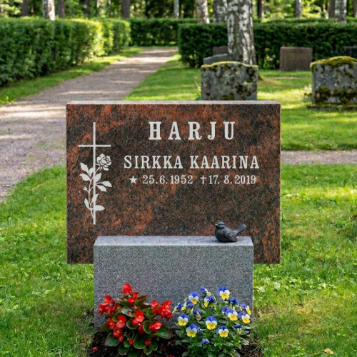 Kaiverrettu kaunis ruusuristi täydentää perinteisen hautalaatan ulkoasun. Tämä hautalaatta on mahdollista koristella graniittisen jalustan reunalla istuvalla pronssisella varpusella. Kotimainen laadukas pronssivalutuote on valittavissa lisäominaisuutena.