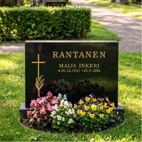 Perinteiset mittasuhteet omaava hautakivi kauniilla ristiä koristavalla kielolla. Suorakaiteen muoto ja kullatut tekstit tekevät muistomerkistä ajattoman ja rauhallisen kokonaisuuden. Voit valita lisäominaisuutena myös kiillotetut sivut. Tämän muistomerkin päälle sopii erinomaisesti lisävarusteena saatavat pronssivarpuset, jotka pehmentävät muuten suoraviivaisia muotoja. Lisäksi saatavilla on myös kukkareunakivet tai kukka-aukollinen pohjakivi pitämään istutusalue siistinä ja helppohoitoisena.